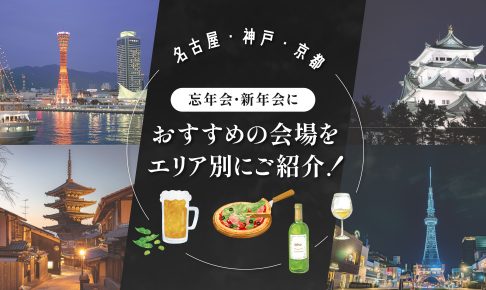 特集もうすぐ忘年会・新年会シーズン。一年を締めくくるor新たな一年をお祝いする場所は決まりましたか?まだ決まってないという方に向け、この記事では名古屋・神戸・京都の忘年会・新年会におすすめの会場をご紹介します! 名古屋エリア…