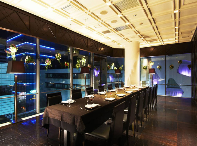 銀座駅から徒歩1分の位置にあるフレンチレストラン。ブラウンとゴールドを基調としたシックな店内は、銀座にふさわしい優雅でラグジュアリーな雰囲気に満ちています。大きな窓からは銀座の夜景を見渡すことができ、贅沢な食材を使ったフレンチと一緒に嗜めば最高のひと時に。店内には6〜12名ほどの個室を完備している他、大ホールを区切って20名ほどで使用することも可能。個室専用のプランがあるので、ぜひ特別な日にご利用ください。