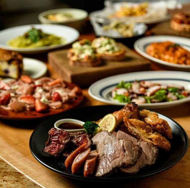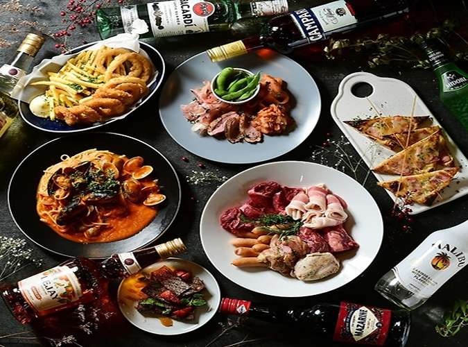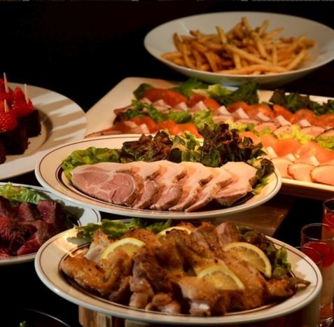 イタリアンをベースにした華やかなパーティー料理をビュッフェスタイルまたはテーブルシェアスタイルでご提供。前菜からフリット、グリル料理、ペンネ、デザートまで幅広いラインナップが揃い、フリードリンクは120種類以上。ビール、ハイボール、ワイン、サワー、各種カクテル、ソフトドリンクを存分にお楽しみいただけます。ご予約はお早めに。