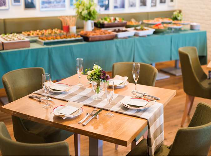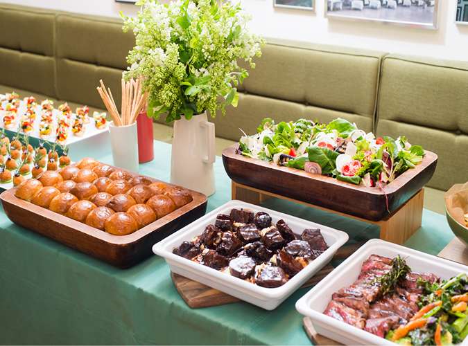 店内は全席Wi-Fi完備のほか、TVモニター&プロジェクター、ワイヤレスマイクを無料レンタル可能。2~4名掛けテーブルを連結できる広々100席のフロアはビュッフェ形式やシアタースタイルなど自由にレイアウトでき、テラス席を含めた多彩な演出シーンに対応します。企業イベントや交流会の機材相談も承ります。お気軽にお問い合わせください。