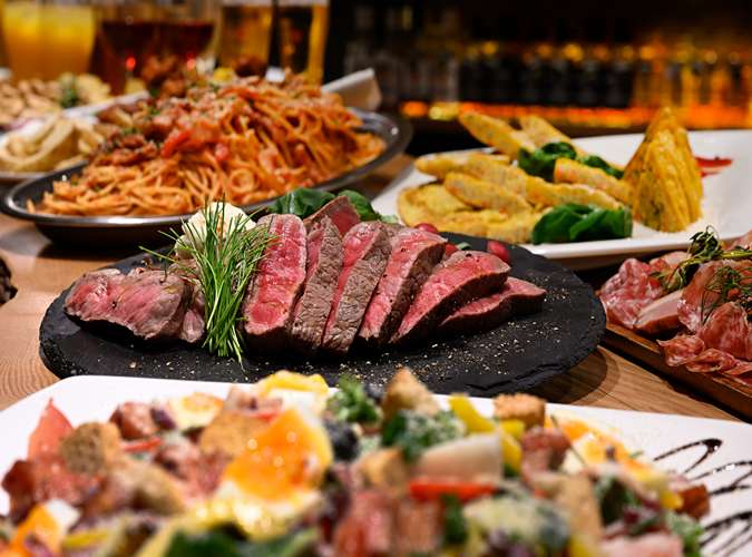 シェフが調理する美味しい料理がビュッフェ形式でご提供されます。肉・魚料理のメイン料理に、お酒のおつまみやお腹にたまるフードも各種ご用意がございます。
