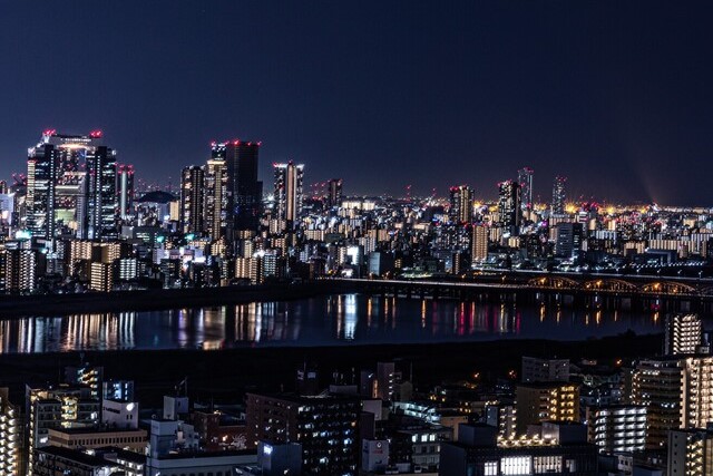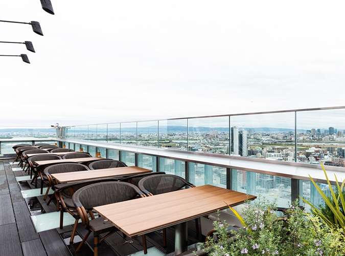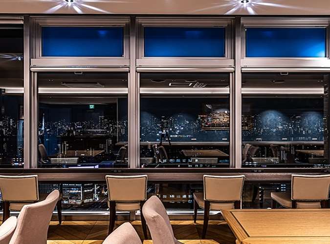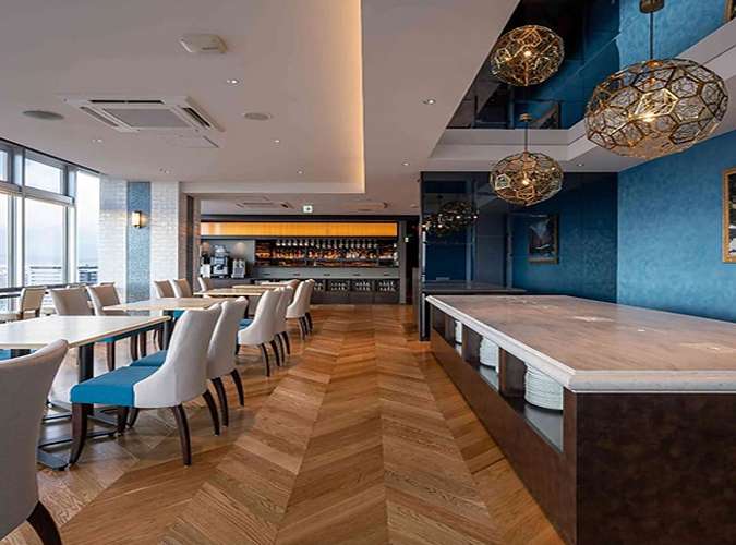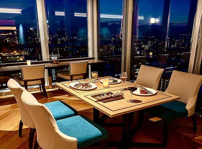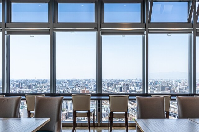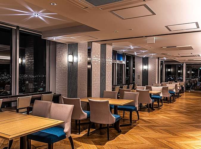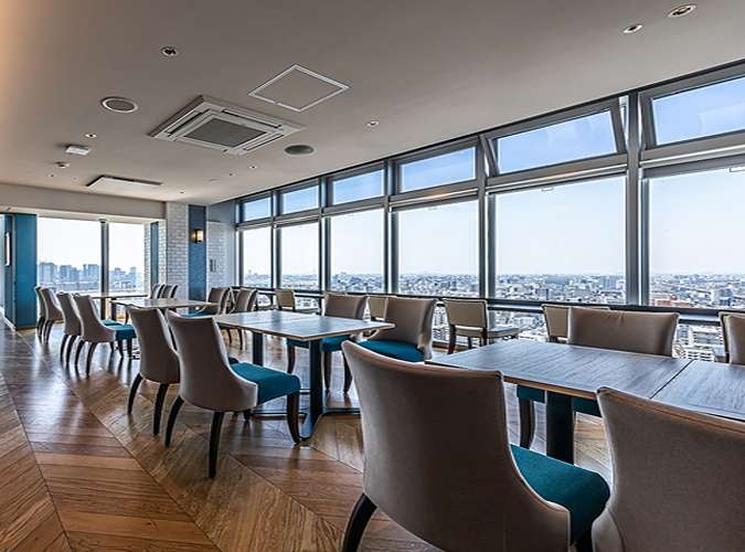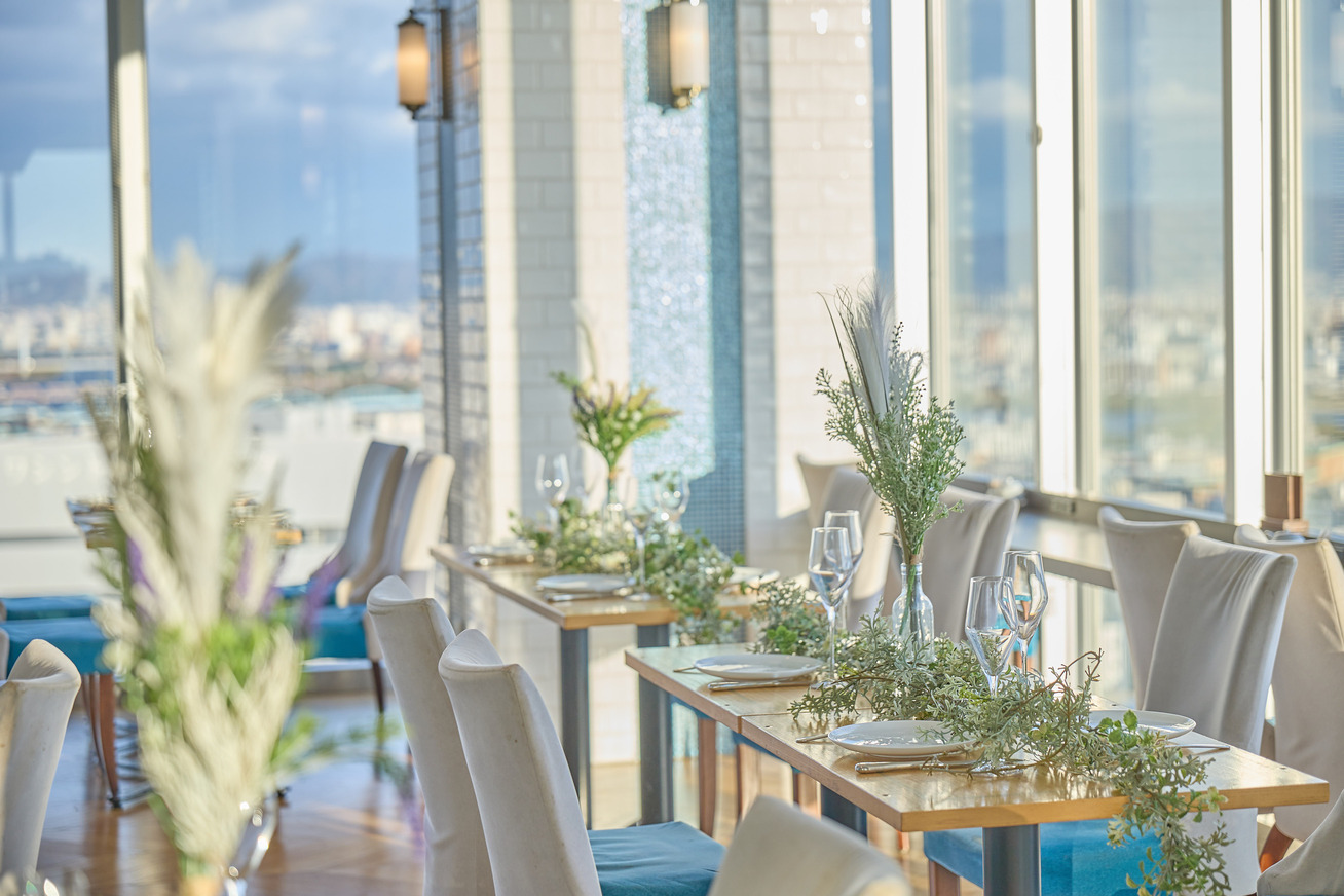 大阪メトロ・新大阪駅7出口から徒歩3分、「アパホテル 新大阪駅タワー」の最上階にある和食レストラン。ウッド調のインテリアにアクセントカラーのブルーが映える店内は、モダンな雰囲気が印象的。一面大きな窓ガラスに囲まれており、昼間は新大阪の街並みや淀川、夜は新大阪周辺の夜景を楽しめる。地上100mから望む景色は、時間を問わず絶景。ちょっとしたお祝いや記念日から、結婚式の二次会や同窓会など本格的なパーティーまで、幅広い用途におすすめ。