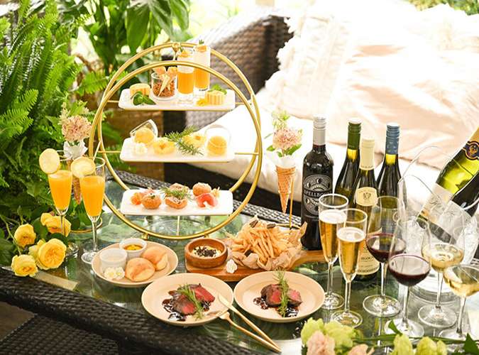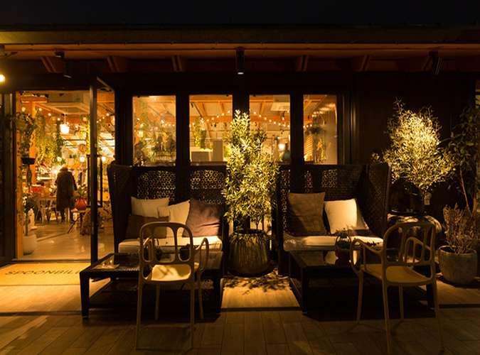 いたるところにグリーンや綺麗なお花があしらわれた、おしゃれなボタニカルダイニング。白を基調とした空間に植物の緑が映え、大きな窓から自然光が降り注ぐ特別な空間は、まさに都会のオアシス。日々の喧騒を忘れ、リラックス感たっぷりの贅沢なひと時を過ごせる。また、夜はオレンジ色のライトが温かみを醸し出す優雅な空間へと変身。時間を問わずくつろげるテラス席も利用したい。