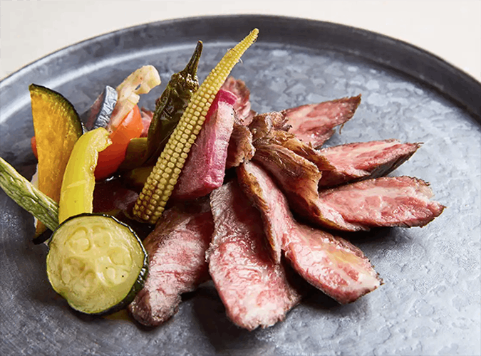 薪火でじっくり加熱したベーコンを使ったサラダ、スペアリブなど、ここでしか味わえない逸品を堪能できる。全国各地から選りすぐった四季折々の食材を使用しているため、季節の味を楽しめる点も嬉しい。フリードリンクはビール、ハイボール、梅酒、焼酎に加え、ワイン、スパークリング、日本酒もセレクト可能。料理とのペアリングを楽しめば、お酒好きも美食家も大満足すること間違いなし。