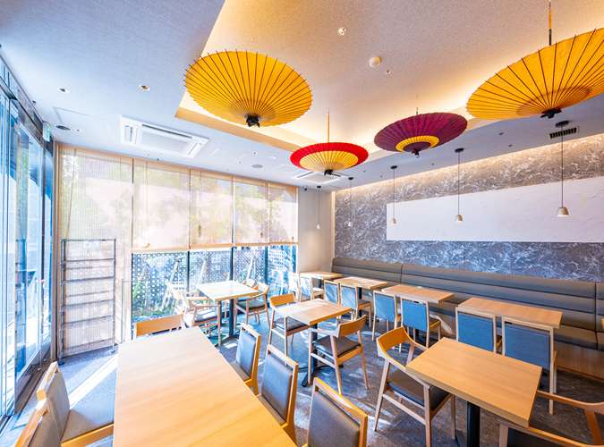 天井から吊り下げられた番傘、日本の伝統柄が施されたインテリアなど、和のエッセンスが目をひく洗練されたダイニング。大きな窓ガラスに囲まれ、グリーンで彩られた店内は適度に開放感があり、心地の良い時間を過ごせる。