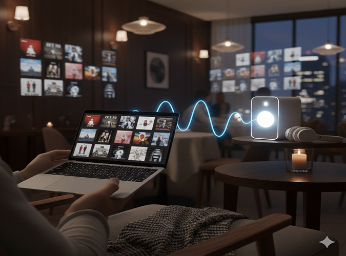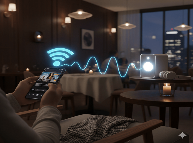 100インチのプロジェクターや音響設備、マイクはすべてワイヤレス対応。スマートフォンやパソコンからそのまま接続でき、面倒な配線や特別な機材準備は不要です。