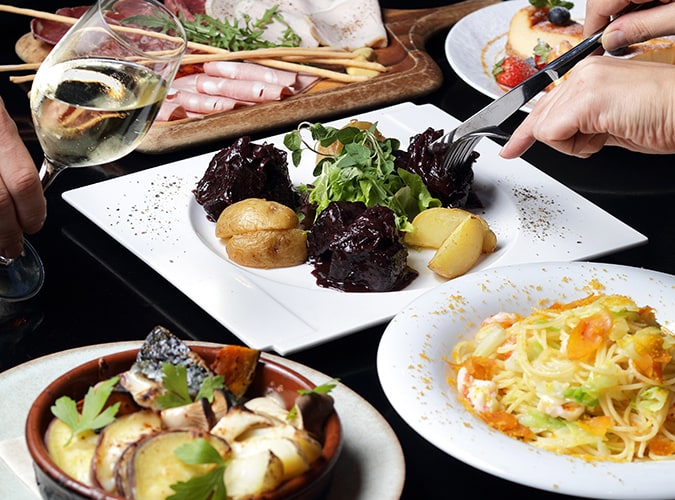 白塗りの壁に囲まれた長方形のメインフロアは視界を遮るものがなく、天井から吊るされた木製シャンデリアが温かなオレンジの灯りを演出。壁一面のガラス張りから差し込む自然光でナチュラルな雰囲気が広がり、目の前のガーデンテラスを一望できます。着席40名・立食100名の貸切パーティーに、ぜひご利用ください。