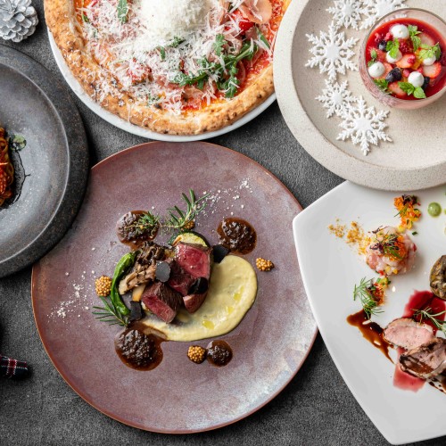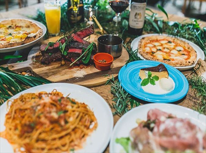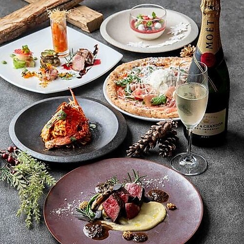 オープンキッチンから提供される窯焼きピッツァは“カリッ、モチッ”の食感が自慢。ナチュラルフードや銘柄牛を使った一品も含む全コースは6,000円~8,000円(税込)で、飲み放題プラン(2時間)付き。平均予算7,000円~/人で、送別会・歓迎会・結婚式二次会など貸切目安人数40人~に最適です。旬の食材を活かした料理でゲストをおもてなしします。