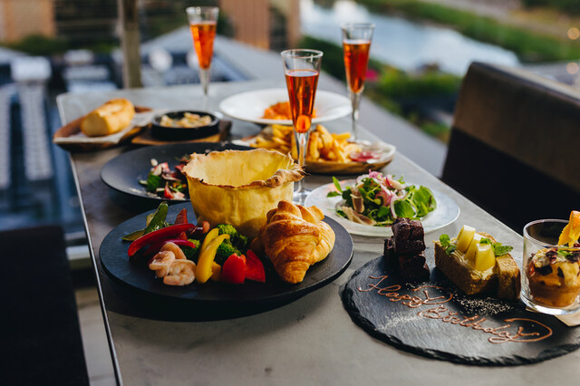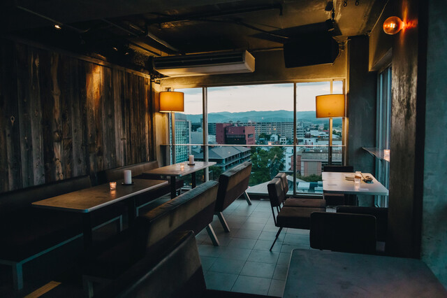 大きな窓ガラスに囲まれた10階のフロアは、昼は鴨川や東山の緑豊かな景色、夜は京都の夜景が一望できる開放的なロケーション。シックなソファ席とオレンジの間接照明が織りなす落ち着いた空間は、三条駅周辺の貸切パーティーにもぴったりです。京都エンパイヤビル内で非日常のひとときをお楽しみください。ぜひ店内のパノラマビューを体感してみてください。