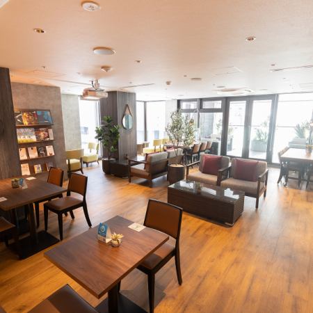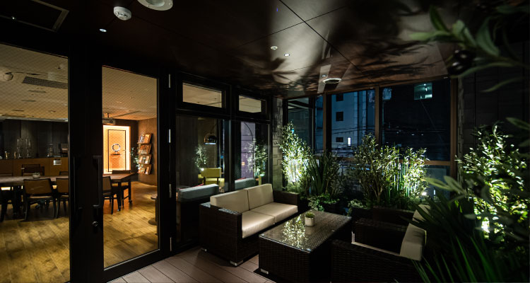 大阪市浪速区難波中に位置し、デザイナーズホテル「GRIDSプレミアムホテル大阪なんば」1Fのラウンジ空間。ダークトーンで統一された1階と2階、テラス席の3層構造が大人の落ち着きを演出します。なんば駅徒歩2分の好立地で、非日常のアットホームなパーティーシーンをお楽しみいただけます。ぜひテラス席でゆったりと特別なひとときをお過ごしください。