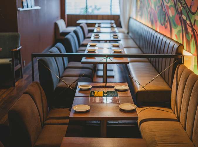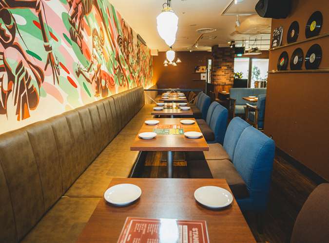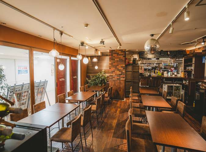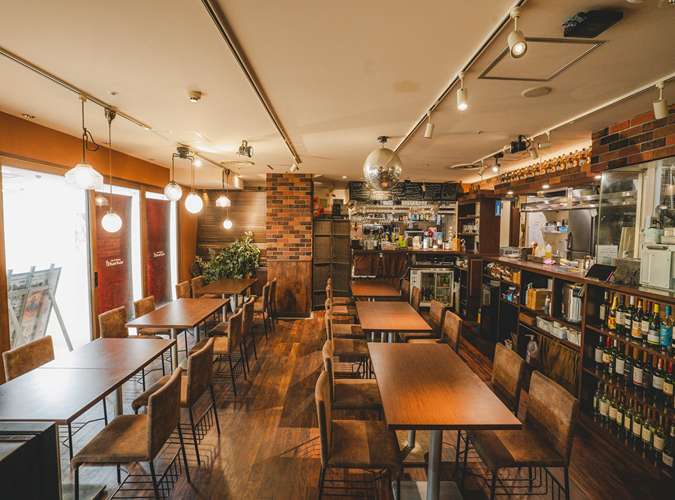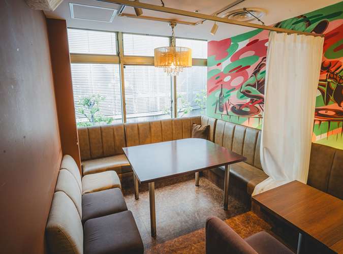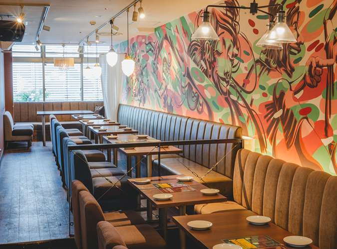 ダークトーンのナチュラルウッドとレンガを基調とした大人のカフェダイニング空間は、壁面のウォールアートとミラーボールが華やかさをプラス。移動可能なソファ席で、着席60名・立食100名までのレイアウト自由度が高く、女子会やウェディング2次会、企業イベントなど多彩なシーンに対応します。有楽町・銀座エリアならではのアクセスとアットホームな雰囲気をぜひ体感してください。お問い合わせはお気軽にどうぞ。