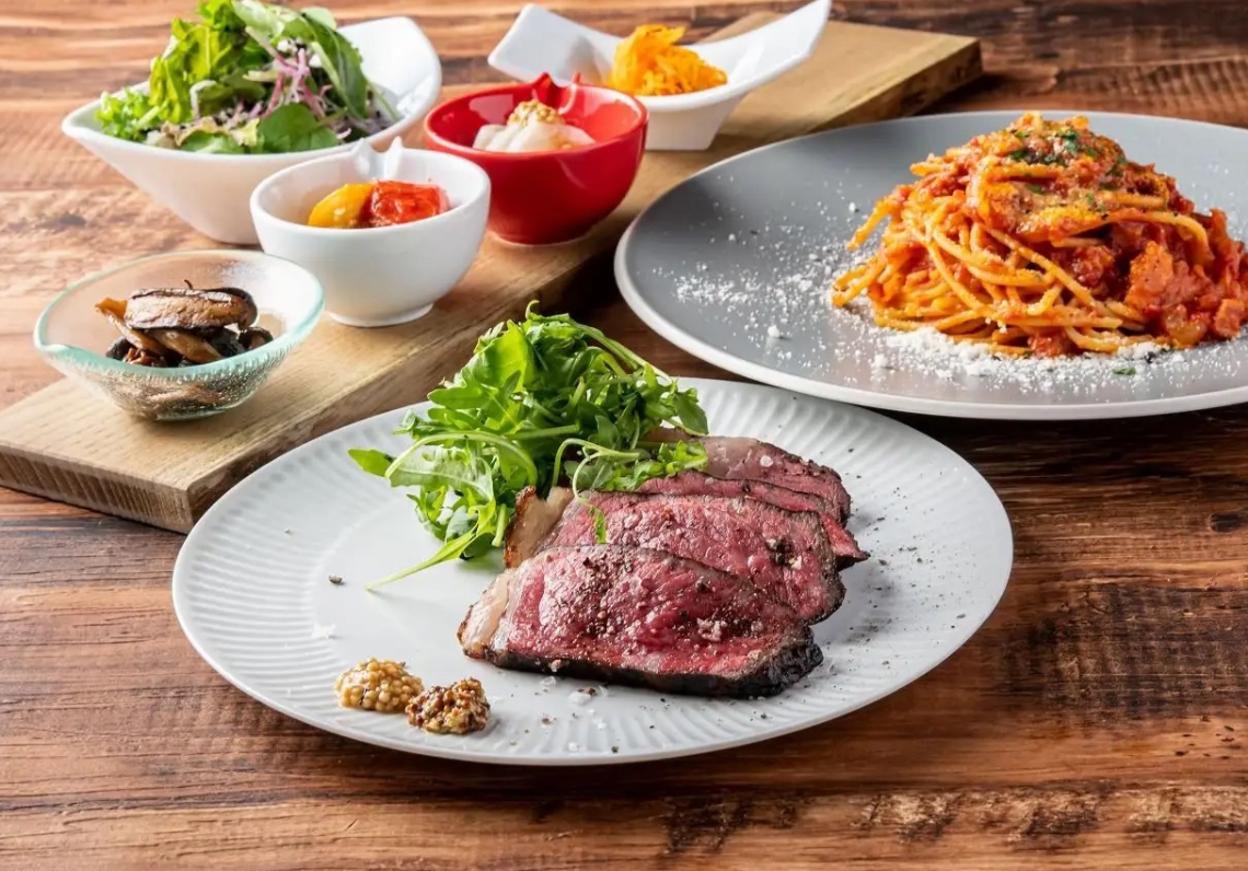 「アルコバ」では、京都の有名レストランの料理長を務めたシェフが手掛ける絶品イタリアンが堪能できます。特に自慢は「マキヤキ」と呼ばれる薪で焼く肉料理。シンプルな塩胡椒で味付けし、丁寧に火入れをして柔らかく仕上げたその味わいは、まさに絶品。さらに、フリードリンクを楽しみながら、冷菜から自家製ドルチェまで本格的な料理を堪能できます。見た目も美しい料理は、ゲストへのおもてなしに最適です。