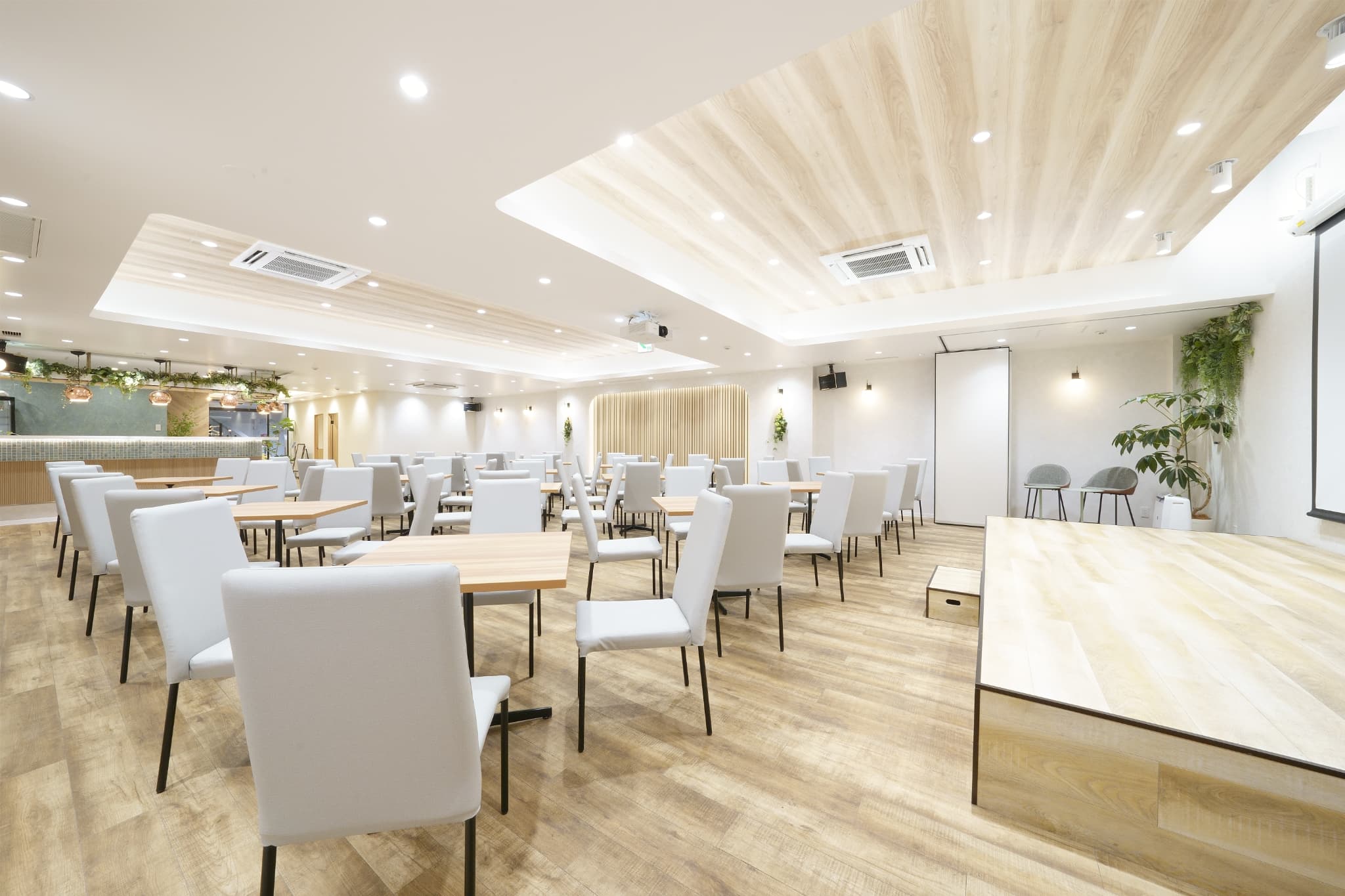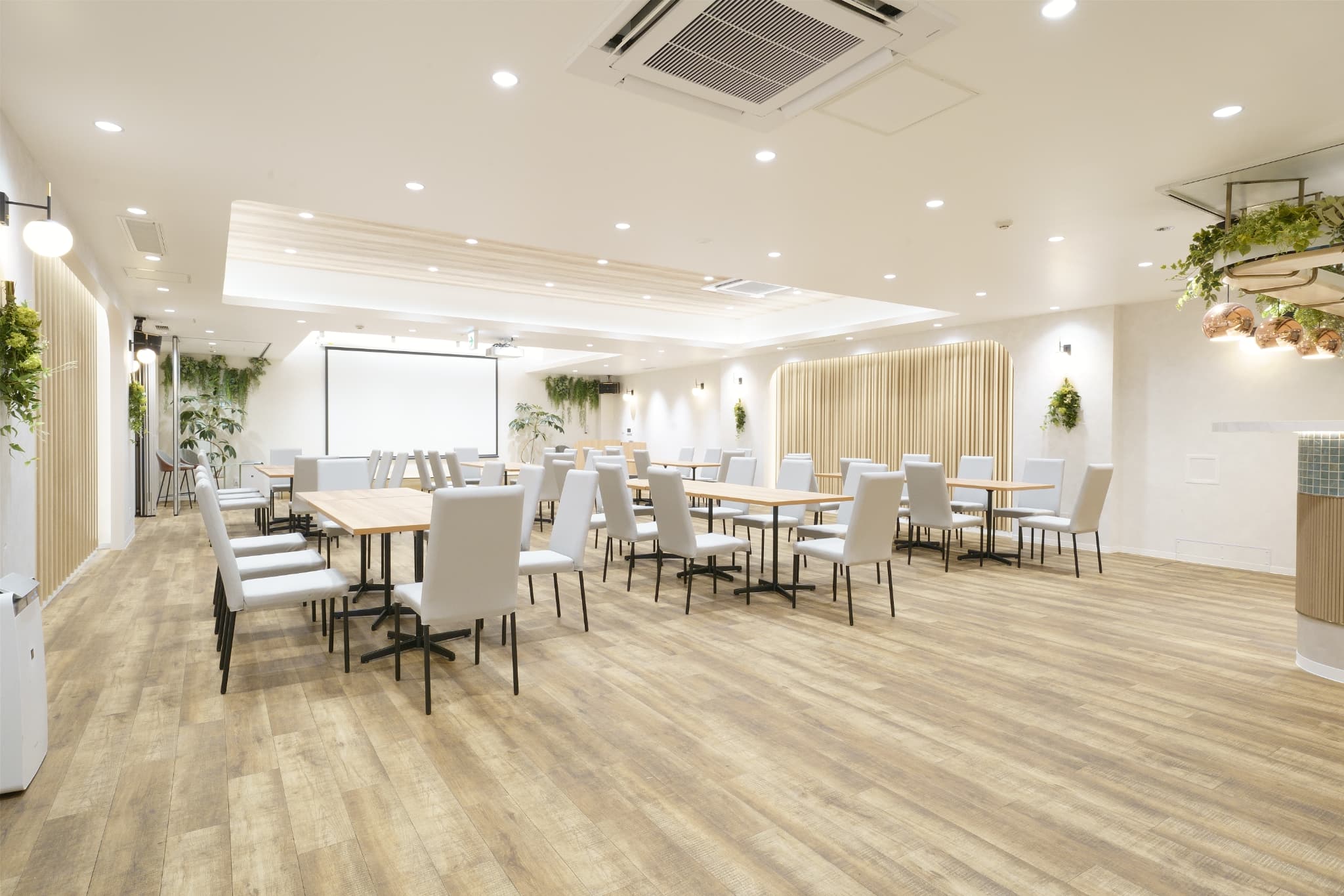 会場には高速Wi-Fi、TV・プロジェクター、130インチスクリーン、ステージ、音響設備、マイクを完備。控室やクロークスペース、司会台、キッチン付で、本格的なパーティー演出にも対応可能です。イス・テーブルはすべて可動式で、着席85名・立食120名までアレンジ自由。セミナーや交流会、懇親会でも快適にお使いいただけます。まずはお気軽にお問い合わせください。