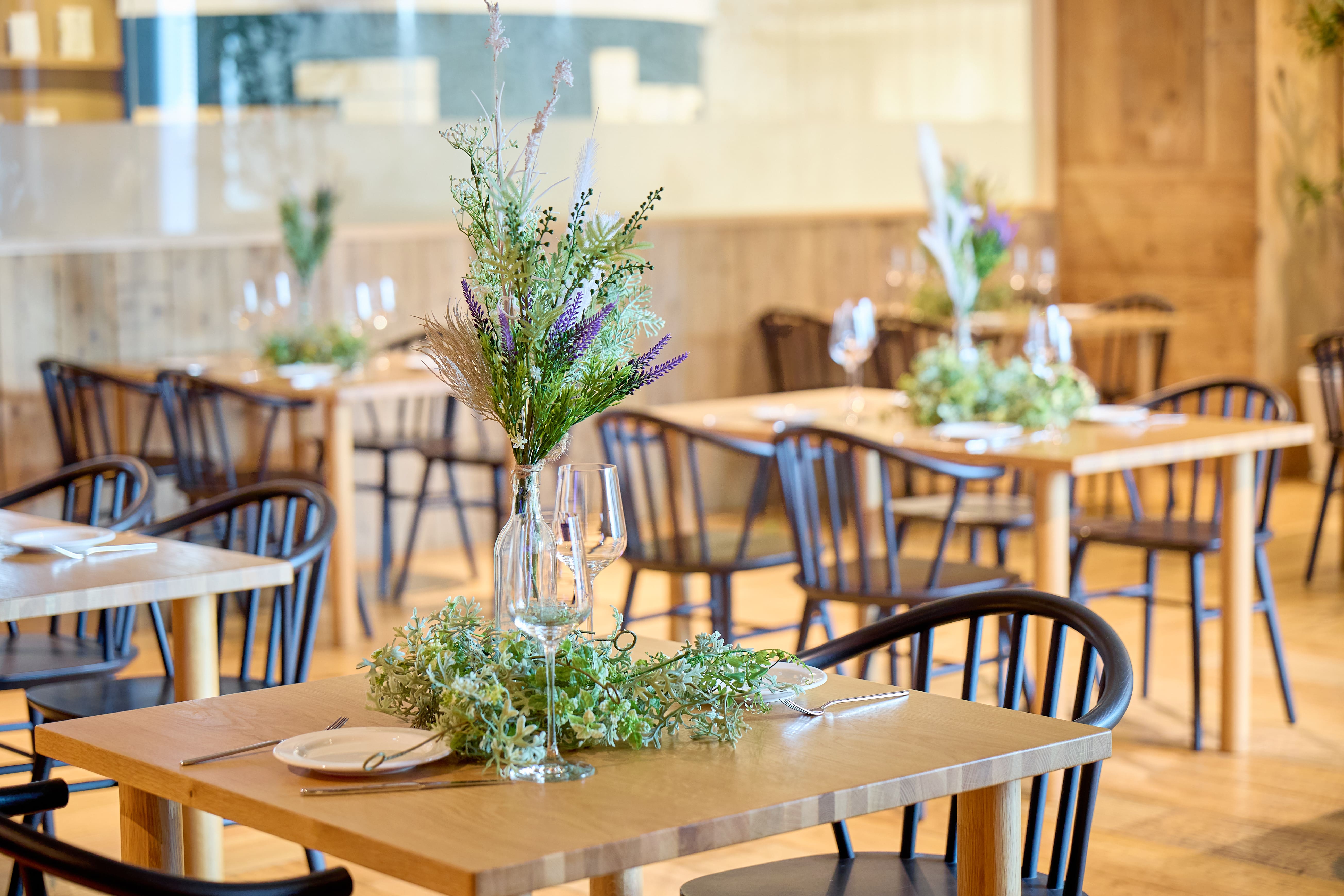 グランフロント大阪4階に位置し、ナチュラルウッド調を基調としたインテリアにグリーンが彩る店内は、梅田・大阪駅エリアにいながらリラックス感あふれる癒し空間です。天井高で広々としており、窓際からは大阪の風景も望めます。着席110名・立食150名収容可能なので、大規模な会社懇親会やウェディング2次会にも向いています。ぜひ一度現地の穏やかな雰囲気を感じてください。