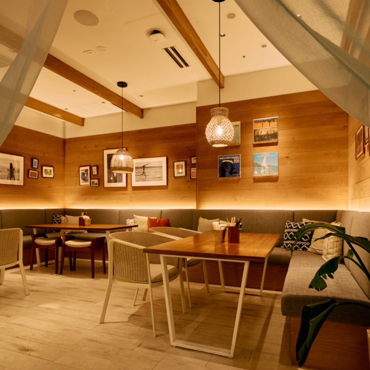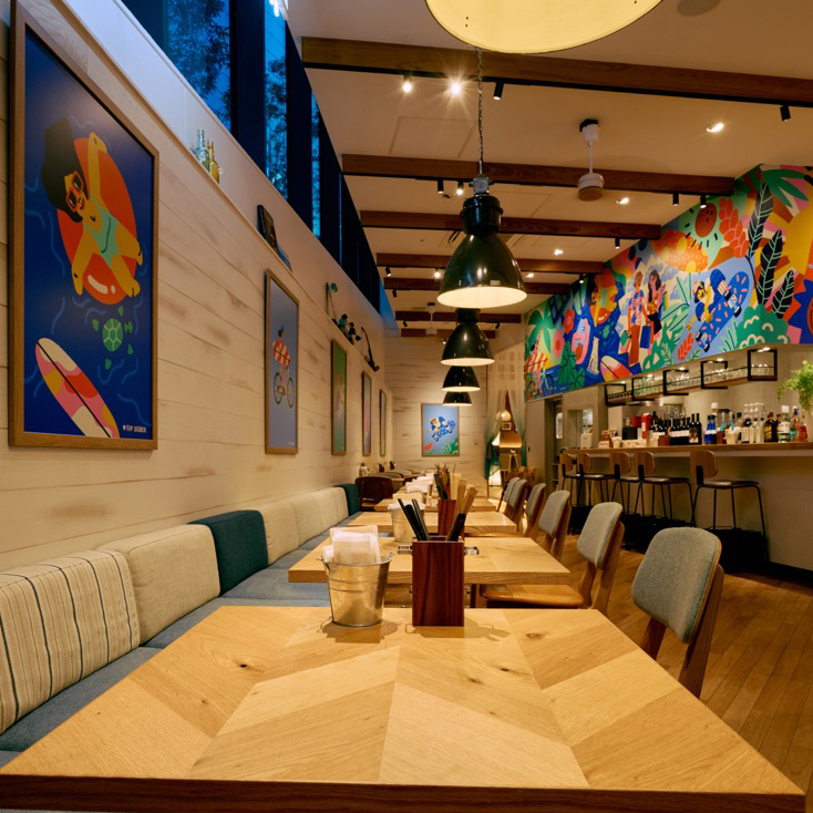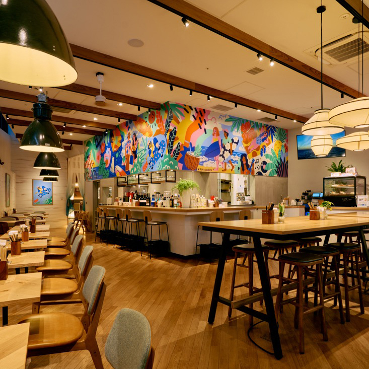 「hale'aina HOA 渋谷」は、ハワイのビーチリゾートを思わせるリラックス空間。店内の壁面にはハワイ出身のアーティストKim Sielbeckによる色鮮やかなアートが描かれており、非日常感を演出します。天井が高く開放感に満ちた空間は、着席最大70名・立食最大100名まで対応。渋谷駅から徒歩1分という好立地で、結婚式二次会や懇親会など幅広いパーティーシーンに最適です。南国リゾートのような雰囲気の中、ゆったりとした時間をお楽しみください。